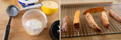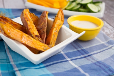 Crisp rosemary baked sweet potato fries served with a low-fat garlic aioli made with plain goat yogurt.