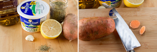Thoroughly wash and scrub the sweet potato. Remove the tips from either end.