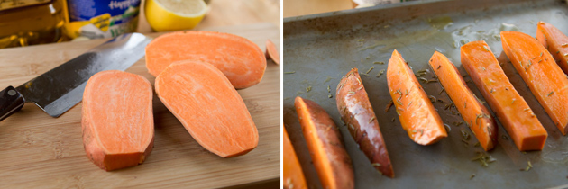 Place wedges on the baking sheet and coat with oil, rosemary and salt. Place in the oven for a total of 25-30 minutes, filliping halfway through.