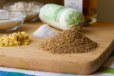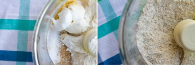 Combine flours, oil, mustard powder, and salt in the bowl of your food processor. Using dough blade, pulse until combined and crumbly.
