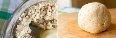Add water and vinegar, turn processor on and let it run for 20 seconds. Continue to add additional water, 1 tablespoon at a time until the dough forms into a ball at the side of the bowl.