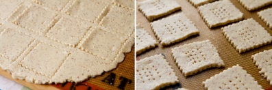 Roll dough to 1/4-inch thickness. Using a pastry cutting knife or cookie cutter, cut cracker-like shapes in the dough. Place on prepared cookie sheet with minimal spaces between each. Poke holes in the top of each cracker with a fork, if desired.