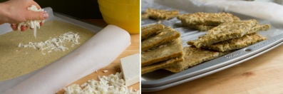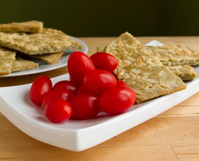 Sprinkle with cheese and slide the baking sheet into the preheated oven. Bake for 25 minutes. Remove from the oven, cut into slices, wedges, or crackers. Remove parchment paper from baking sheet and place cut pieces back onto the baking sheet. Bake for another 10-15 minutes to crisp up.