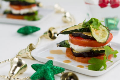Once the veggies are done, begin layering by starting with a tomato slice, then eggplant, zucchini, a bit of goat cheese and repeat once more through. Top with a couple of drops of salad dressing and a sprinkle of fresh parsley.