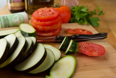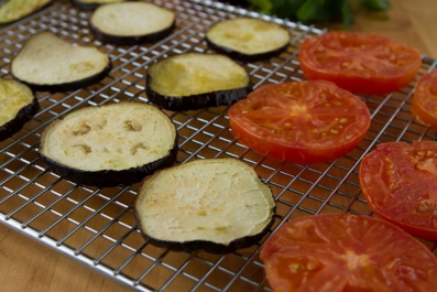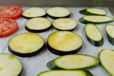 Arrange eggplant, tomato and zucchini slices in single layer on the prepared sheets. Brush both sides with oil and sprinkle with salt and pepper.