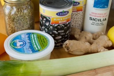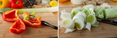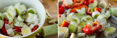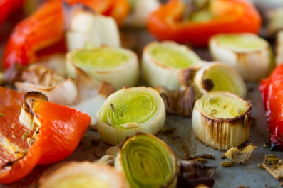 Place red bell pepper, garlic cloves, ginger, leek and fennel seeds on a medium-sized cookie sheet. Top with 1 teaspoon extra-virgin olive oil and stir to coat.