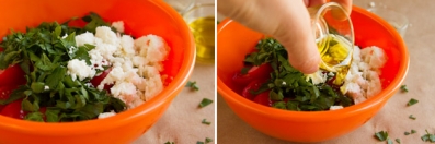 Add the veggies and cheese to a bowl and drizzle with oil and vinegar.