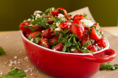 Simple feta-based salad with fresh grape tomatoes, olive oil and a splash of vinegar