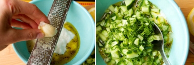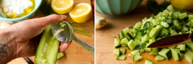 To make the tzatziki, cut cucumber in half lengthwise and remove seeds with a spoon. Chop up into small pieces.