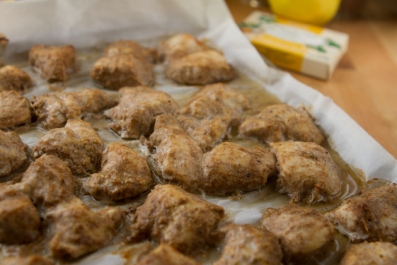 The next day, preheat oven to 375F and line a baking sheet with parchment paper or a silicon baking mat. Place marinated chicken on sheet, spreading out so that they cook evenly. Bake in the preheated oven for 15-17 minutes, until internal temperature reaches 170F. Remove from the oven and set aside.