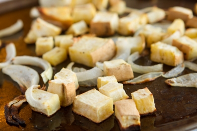 Combine onion, potato and 1 teaspoon of the oil on a small baking sheet. Toss with sea salt and pepper, to taste. Transfer sheet to the preheated oven and roast for 20-25 minutes, until browned and softened. Rotate halfway through.