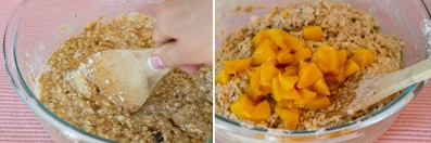 In a large bowl, mix together oats, yogurt, brown sugar, pureed peach, maple syrup and eggs.