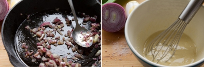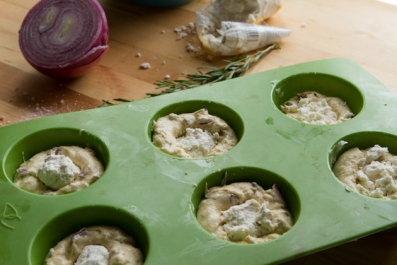 Add dry mixture to wet and stir with a fork until just combined. Fold in cooked onion mixture and savory.