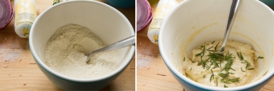 Then, combine flour, baking powder, salt and pepper in a small bowl and mix with a fork to combine.