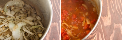 Add oil to a large saucepan. Heat on medium-high heat. Add onions, garlic, salt and pepper and sauté for 5 minutes.