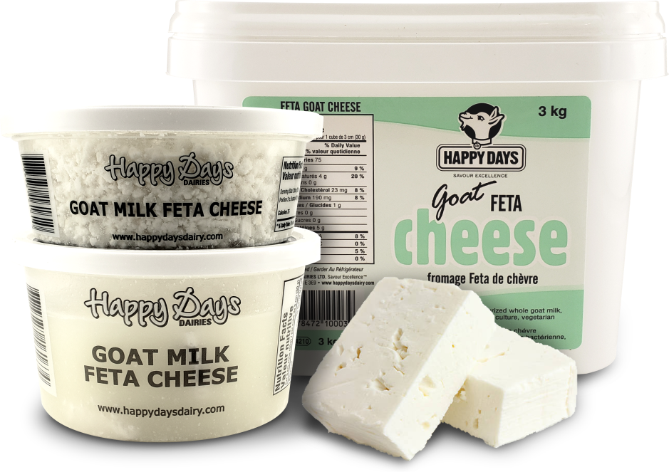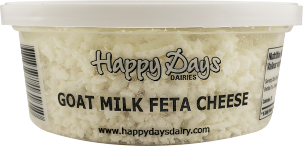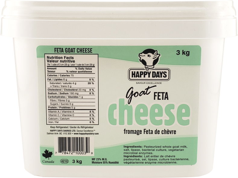 Le feta au lait de chèvre Happy Days est fabriqué de manière artisanale, sans ajout de lait en poudre ou de lactosérum en poudre. Il s’agit uniquement de lait de chèvre frais pasteurisé, de présure et de cultures bactériennes.