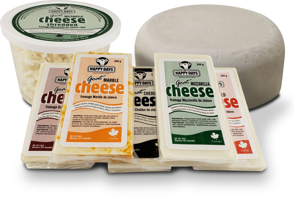 Nous fabriquons un cheddar blanc et un cheddar marbre, une mozzarella, un gouda et une version de cheddar doux.