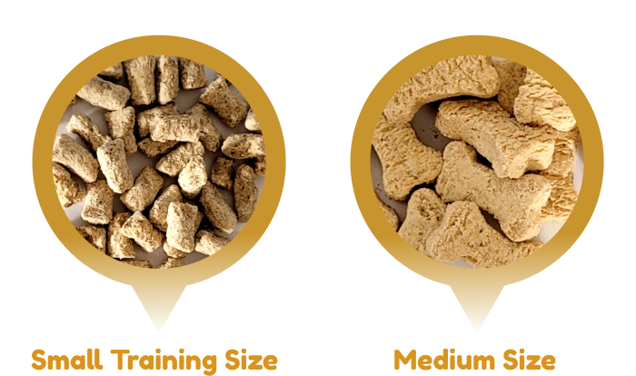 We offer 2 sizes: a medium bone shaped treat, and a small training treat size.