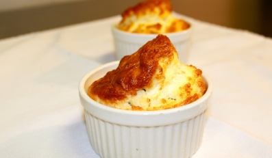 Bake the Souffles for about 20 minutes, or until a beautiful brown. Serve Immediately and garnish with a couple slices of Happy Days Goat Cheese and rosemary.