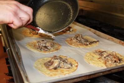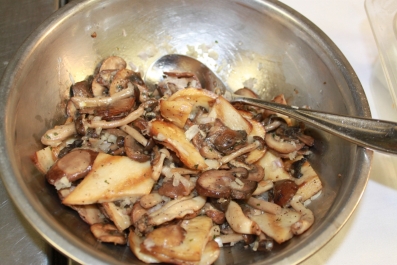 On a baking pan lined with parchment paper, put a Crepe down, add a couple spoons of the Mushroom and Cheese mixture and roll it or fold it into whatever shape you like. Repeat for all the crepes, then reheat in the oven for 10 min at 300.