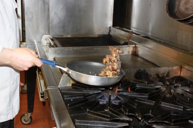 In another Saute pan, add the Butter and start sauteing the Mushrooms, Garlic and Shallots over medium heat. Once they start to brown, add the Happy Days Goat Cheese. Season with Salt and Pepper.