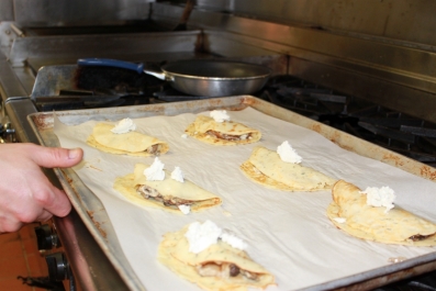 Optional – Divide the rest of the package of Happy Days Goat Cheese and melt on top of the folded Crepes, when they get re-heated in the oven.
